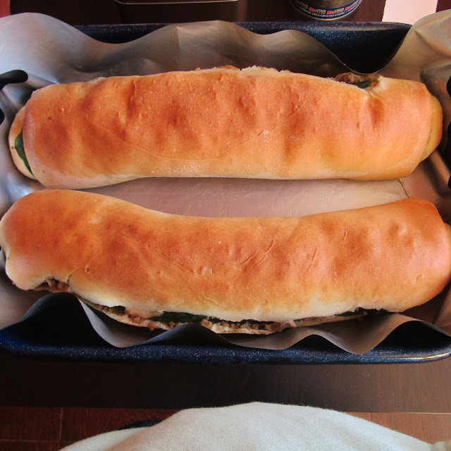Запържвам каймата в малко олио, като я надробявам ситно, добавям нарязания лук, (както и гъби), сол, черен пипер, пикантина. Дръпвам настрани от котлона. През това време разточвам на правоъгълник тестото, с дължина, колкото ми е дълга тавата. Върху тестото нареждам суровия спанак, като покривам цялата повърхност с няколко слоя, докато свърши, отгоре разстилам каймата, навивам на руло и поставям в намаслена тавичка, с шева надолу. Пека на 180-200 градуса, без предварително загряване до готовност – зачервяване на коричката и при почукване да бие на кухо, бързо се изпича.